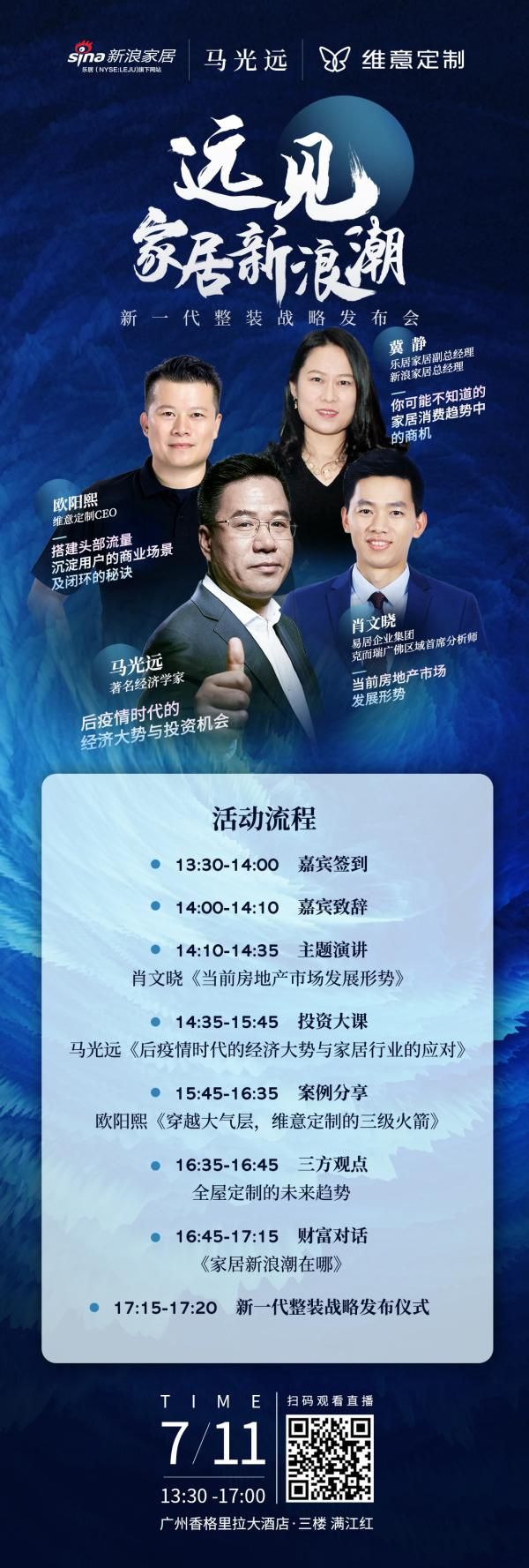 7月11日发布会现场,维意定制CEO欧阳熙将现场解读维意定制新一代整装的三级火箭,同在场大咖一同探讨全屋定制的未来趋势。新浪家居将全程直播,扫描图片下方二维码,更多精彩等你解码!