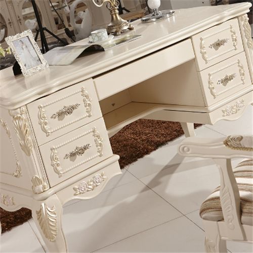3、再来就是给大家说一款欧式书桌,这类书桌非常适用和欧式风格种的书房,但必须要和书房从总体风格要想搭,欧式书桌在做工时非常的精美,特别是在雕塑上非常的精致,有一种欧式宫殿的遗风。