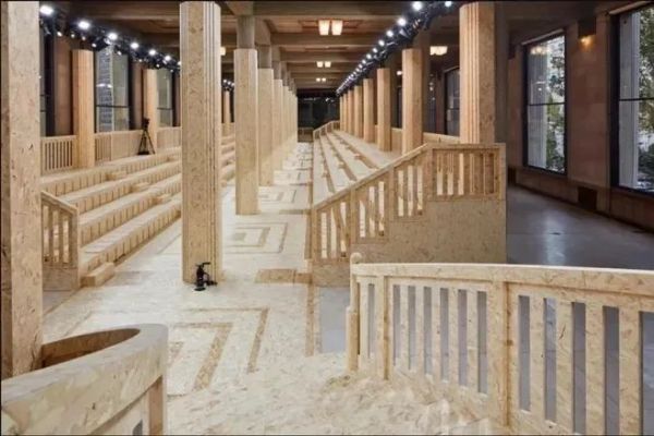不仅如此,MiuMiu2020春夏系列时装秀——失衡之殿,选用了OSB,完美呈现木材与宫殿原有石建筑的融合,并且倡导了环保,可以回收重复利用。