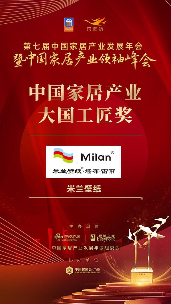 2020年7月8日,在广州举办的第七届中国家居产业发展年会暨中国家居产业领袖峰会现场,米兰壁纸荣获「大雁奖」中国家居产业大国工匠奖。