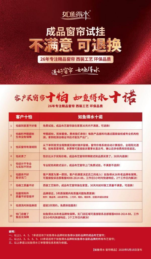 近期,如鱼得水与新浪家居等权威媒体达成合作,通过深入实地调研真正直面消费者,深入了解消费痛点。基于大量调查研究,如鱼得水深感行业旧模式弊端重重。在进行深刻自我反思,痛定思痛后,如鱼得水决定打破行业潜规则,重塑行业正道,郑重推出“客户买窗帘十怕,如鱼得水十诺”,真正做到回馈消费者心声触及消费者利益。