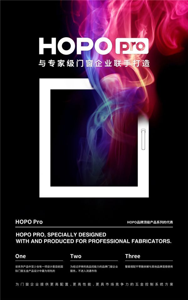 HOPO Pro高端产品解决方案系列应运而生,助力品牌企业高端门窗布局,为门窗企业提供更高配置、更高性能、更具市场竞争力的门窗五金控制系统解决方案。其产品满足三个条件:至少有一项设计在全球领先;只直接服务于经过品质评审的门窗工厂,不进入流通市场;整套搭配,不与其他品牌混搭使用。差异化优势,让客户拥有更好配置、更佳性能、更强竞争力。