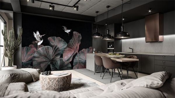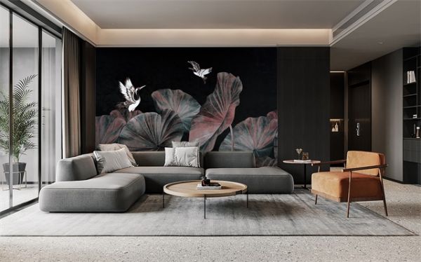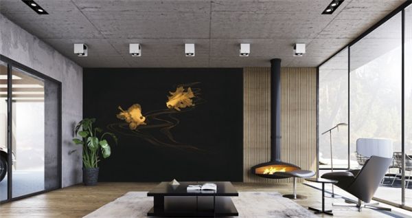 如何让家眼前一亮但又不让人觉得突兀呢?黑白灰为主色调的家居空间是最常见的,也是最普通的配色。汇明A+墙布背景墙也选用同色调的魅影黑,再用金色锦鲤点亮爱家,更富有层次感。
