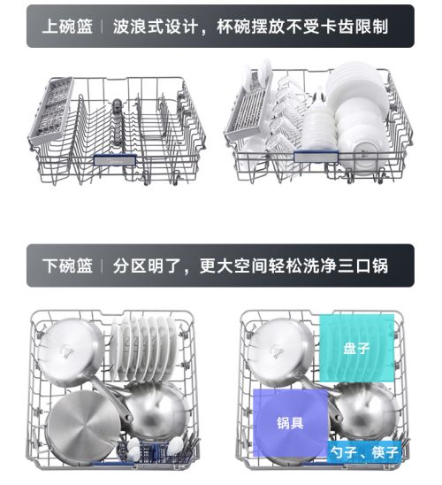 功能模式复杂,该如何选择?大件餐具太多,该如何摆放?选择一台方便又好用的洗碗机,真的要做这么多功课吗?挑选一台好的洗碗机,其实大有学问,但又没有这样复杂。美的中式灭菌洗碗机P40帮您化繁为简,轻松生活听您安排:全新中式易用UI,优化显示布局以及面板按钮设计,无需复杂操控即能启动适宜洗涤模式。功能分区清晰易控,不管是家中的老人还是宝宝,都能轻松操控。波浪形碗篮减少卡齿限制,餐具摆放更快更方便。上层碗篮有效装载高度273mm,碗杯自由摆放不受限制;下层碗篮分区明了,更大空间轻松容纳容炒锅、汤锅、奶锅。