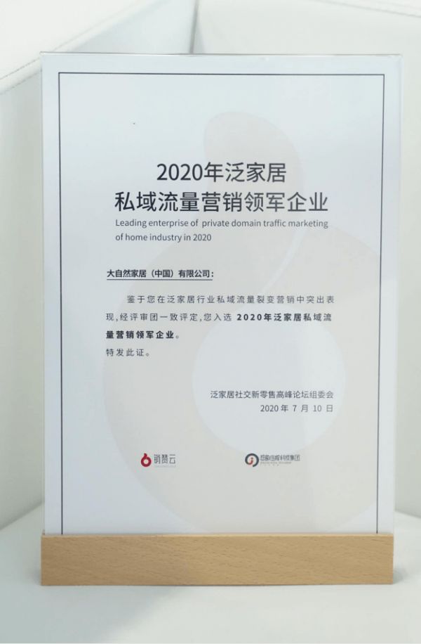 大自然荣获“2020年泛家居私域流量营销领军企业”大奖