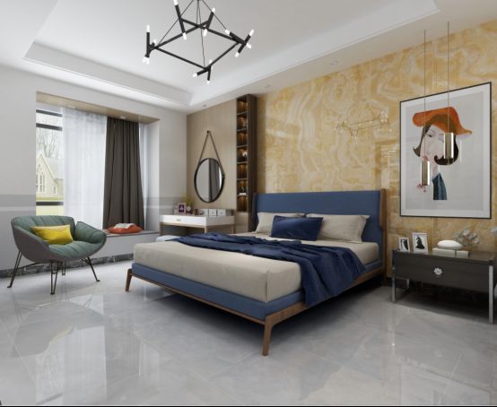 当代表了低调、理性的黄龙玉大面积铺满卧室墙面,辅以跳跃的深蓝的大床点缀,大胆的颜色对立,洋溢出满满的热情气息。
