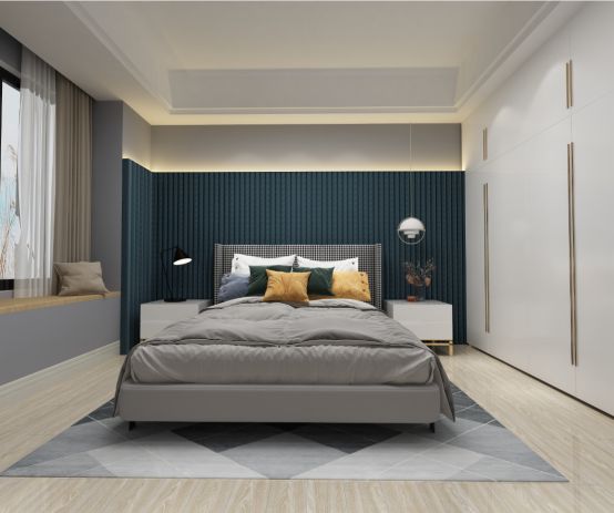 在净色的卧室中,仿古砖莱茵灰橡作为地砖铺贴,深蓝色的竖条装饰背景墙,让空间瞬间有了活力,不仅毫无突兀感,更能够在细节的搭配中彰显主人的高雅品质。