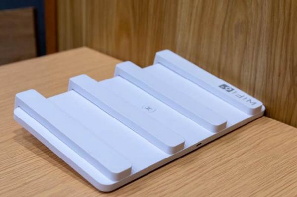 在外观设计上,荣耀路由3与常见的四天线路由差不多,但是天线是与常规路由器不同的扁平状,而且在最右侧的天线上还有明显的wifi6+的logo。这四根天线设计还采用了隐藏式的转轴设计,能以90°的范围进行折叠,打开和收纳都十分便利。