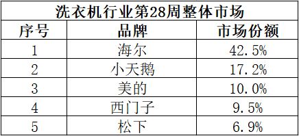 除了电机,内行人还会关注哪些点呢?主要是品牌和功能。从品牌来看,选择主流品牌肯定错不了。从第28周当周数据可以看出,头部Top5品牌市场占比已达到86.1%,其中,海尔占比42.5%,小天鹅占比17.2%,美的占比10.0%,西门子占比9.5%,松下占比6.9%。