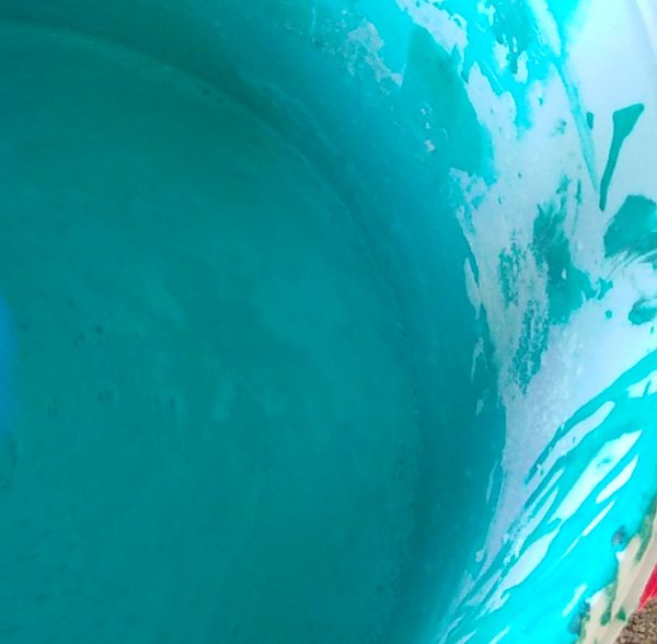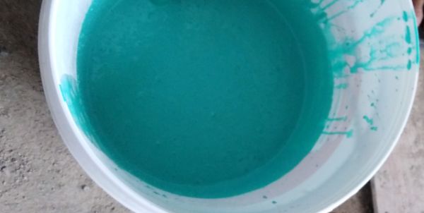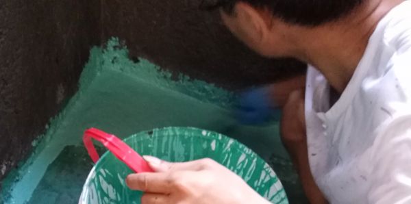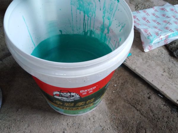 搅拌均匀后,浆料呈现绿色的,颜色非常醒目,这样对于我们新手来说,更加好操作。不容易出现漏刷漏涂。很快,我们就开始第一遍的地面涂刷。本来以为施工过程会有刺鼻的气味,都准备了口罩,愣是没用上。