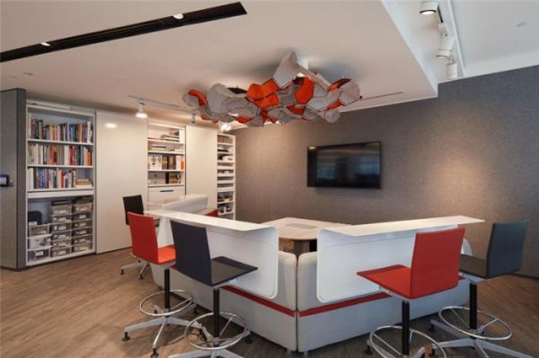 非对称的工位布局打破了空间的无趣死板,无缝衔接的灵活空间可以极大程度激发创造力,而散落分布的站立式工作台也将促进办公室内的协同合作。