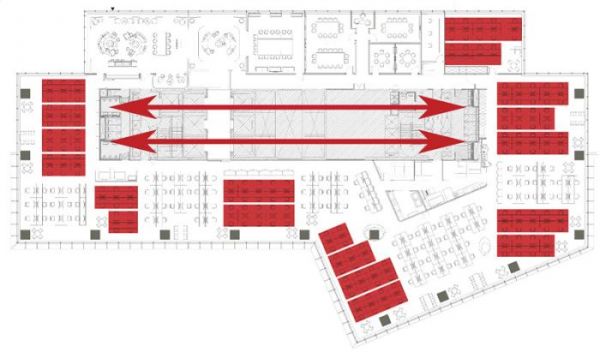 为了让主楼层可以容纳所有设计师的同时,避免出现传统办公室中大规模并排的工作环境,设计团队对原始的平面图进行了调整。以三列工位为一组,每组之间旋转角度,调整方向,在模块化布局中实现视觉的空间分隔,并营造协同合作的便捷空间。