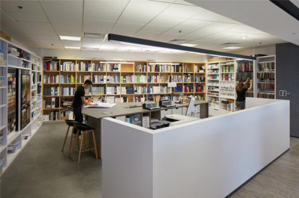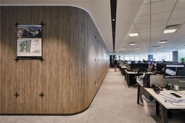 内墙装饰悬挂着Aedas的重点项目。设计将公司logo融入其中,提取以网格为蓝本的 “+”,作为照片墙框架,以A1尺寸为间距,用磁铁悬挂图片,方便项目资料的快速更新。沿主入口和走廊设有开放的陈列架,展示着过往奖杯及作品模型,如同一个作品艺术馆,与工作空间无缝衔接。