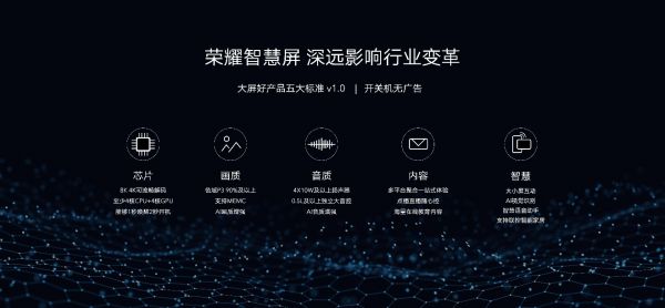 为了改变大屏市场“低质低价”的现状,荣耀在开关机无广告的基础上提出了“画质、音质、芯片、内容和智慧”智慧屏五大标准,藉此规范大屏行业回归产品本身,围绕用户打造更好的大屏产品。