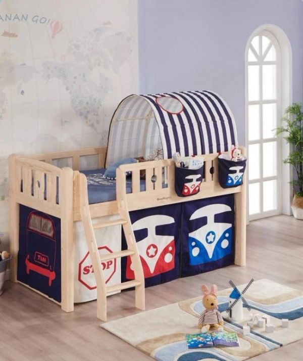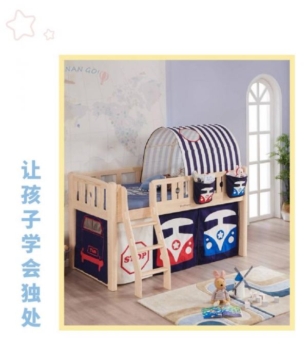上铺是孩子睡觉的地方,床下的空间可以开发成孩子的游戏空间,挂上帘子就自成一个小天地。
