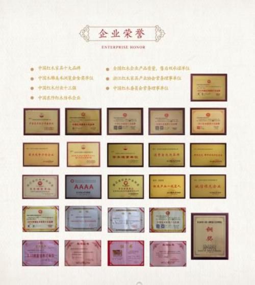 坚守品质,用心服务,方能彰显品牌力量,获得消费者的青睐和赞誉!九雍堂红木在为顾客打造品质生活的道路上从未懈怠过。连续五年被评为“中国红木家具十大品牌”,“中国木雕工艺美术博览会金奖单位”,被浙江省红木产业协会评为“消费者欢迎品牌” “传承文化、榫卯结构示范企业”“诚信领先企业”,被中国木材与木制品流通协会,中国红木委,全国红木行业专家委员会评为“中国东作红木传承企业”,“全国红木企业产品质量、售后服务双承诺单位”,“315质量信得过单位”,连续多年被评为“浙江省信用等级AAA企业”等称号。