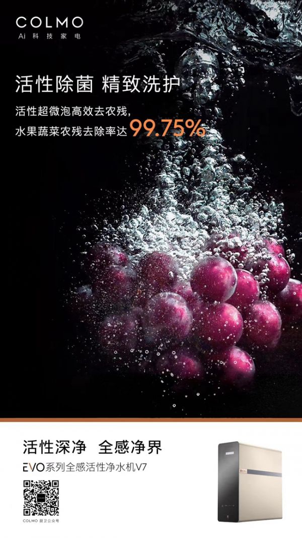 COLMO EVO系列V7全感活性净水机,大量绵密活性超微泡,轻松吸附在食物表层,通过溶解和受力挤压导致细菌壁破裂,深层洗净果蔬农残、有效杀菌,尤其是容易暗藏农残的蔬菜瓜果、食用肉类的激素,也能够彻底洗净,还原食材的新鲜本质,即使简单蒸煮也可以鲜活可口。果蔬农残去除率达99.75%,肉类激素去除率达78.1%。此外, COLMO EVO系列V7全感活性净水机出水富含活性超微气泡深入毛孔内部,深度去除油脂,强力去除依附肌肤表面的细菌,洗手除菌率达94.8%,肉类激素去除率达78.1%。