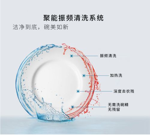 其特有的聚能振频清洗系统,拥有多个震动头。可多方位振频清洗,动力更强,快速冲走餐盘油污,高效又省水!