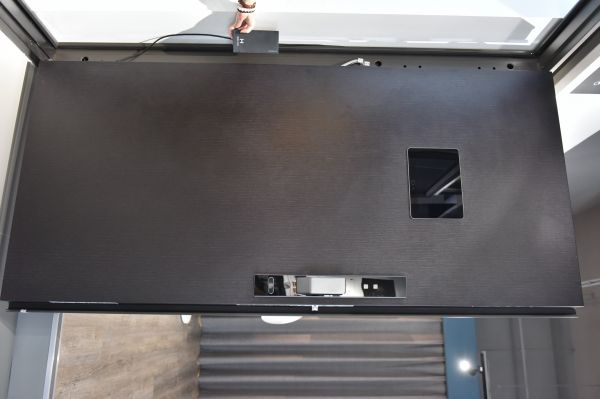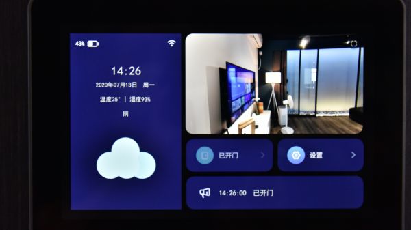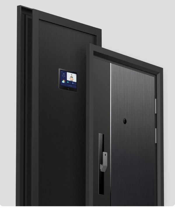 在智慧门门内侧部分中间嵌有一款10英寸超大高清液晶屏,同样采用一体化嵌入设计,与门融为一体。只要人靠近,显示屏会自动亮起。同时,如果有人按门铃的话,液晶屏会自动显示门外情况,还可直接与门外访客语音对话。