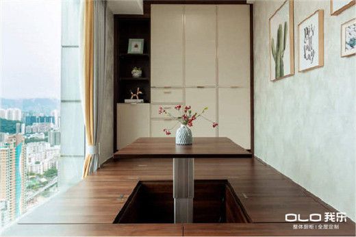 而且,不仅仅是收纳空间,在都市人最需要的“独处”空间中,我乐全屋定制的设计师也巧有心思。考虑到狭窄户型空间的利用,特别将榻榻米设置在靠窗的位置,并在下方增加了收纳空间,确保充分利用每一处空间的同时,还可以让用户轻松坐拥180度美景,将夜晚璀璨的霓虹尽收眼底,闹中取静,给喧闹的都市人打造一方安宁的角落。