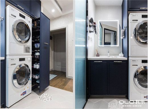 此外,我乐全屋定制设计师还进行了零碎空间的整合与功能区分布的调整,将一些“鸡肋”的空间充分利用。通过定制柜体,提高空间利用率,并在入户处设置了家政功能(洗衣机、烘干机叠放)、卫浴功能(洗漱台)、收纳功能(上方柜体、侧面鞋柜),将功能分区,让用户无论是使用还是清扫都变得更加便利。