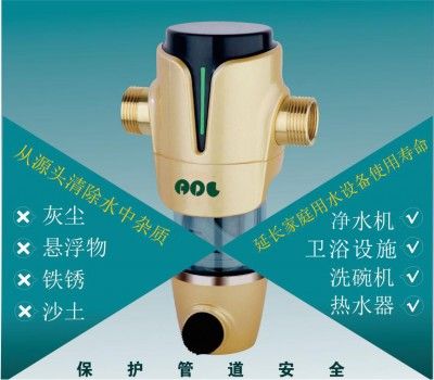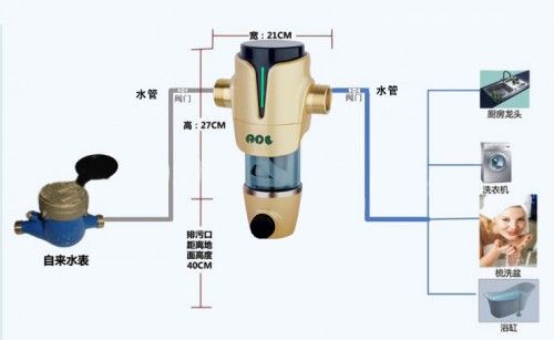 前置过滤器就是二次污染的克星,是一种杂质过滤装置。可过滤细小颗粒杂质,使水质恢复到自来水厂出厂时标准。通常为"T"型结构。上面的"一横"的位置左右两端分别为进出水口。下面的"一竖"位置为机身和内部的筒形过滤网,最下端则为排污口,靠一个阀门来控制开启和关闭。