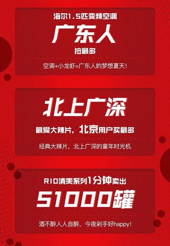 暑热正当头。直播正值头伏前一天,带来了驱暑神器RIO清爽系列,粉丝非常买账,1分钟卖出51000罐。而海尔1.5匹变频空调也被粉丝狂抢,广东省的朋友最热情,夏天全靠空调续命了。可北上广深的年轻人偏偏最喜欢“火辣辣”,尤其北京老铁们最疯狂,抢大辣片抢的欢。必须说一句,峰哥安利的辣片就是香!
