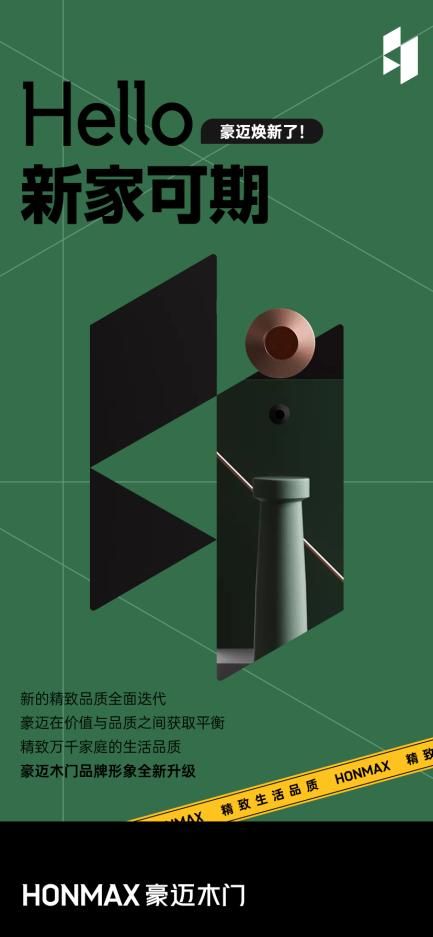 品牌logo作为最具象征意义的符号标志,能直接清晰地展示在消费者面前,无意识形成品牌形象记忆。而在当下信息大引炸的时代,简洁、纯色的logo往往更容易记忆。豪迈木门在此次品牌形象更新时,大胆对品牌logo进行升级,将旧标识多层卷曲线条的设计进一步简化,在新标识中运用单纯简洁的色块拼接。并且,豪迈木门采用时下流行的扁平化设计风格,用直线条构建画面,在延续豪迈专属符号“H”的品牌元素的基础上,改良豪迈木门和“HONMAX”的中文字体,让简约不简单,让细节不细碎。可以说,豪迈木门采用这样抽象概念的图形组合,使品牌logo更具辨识度的同时,也让其品牌标识的“轻”定义得以彰显,更有助于向年轻消费者精准传达品牌信息,形成快速清晰的品牌印象。