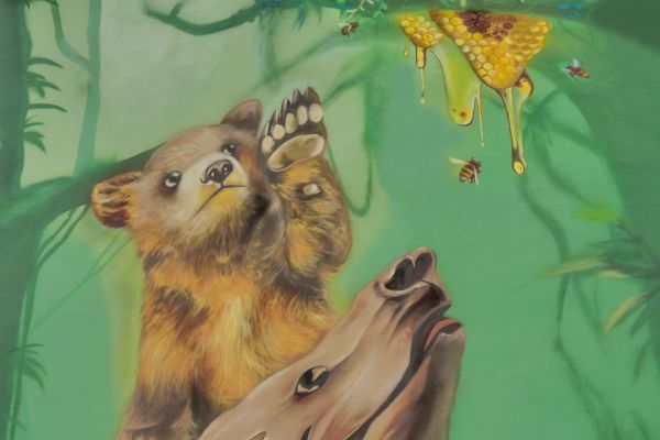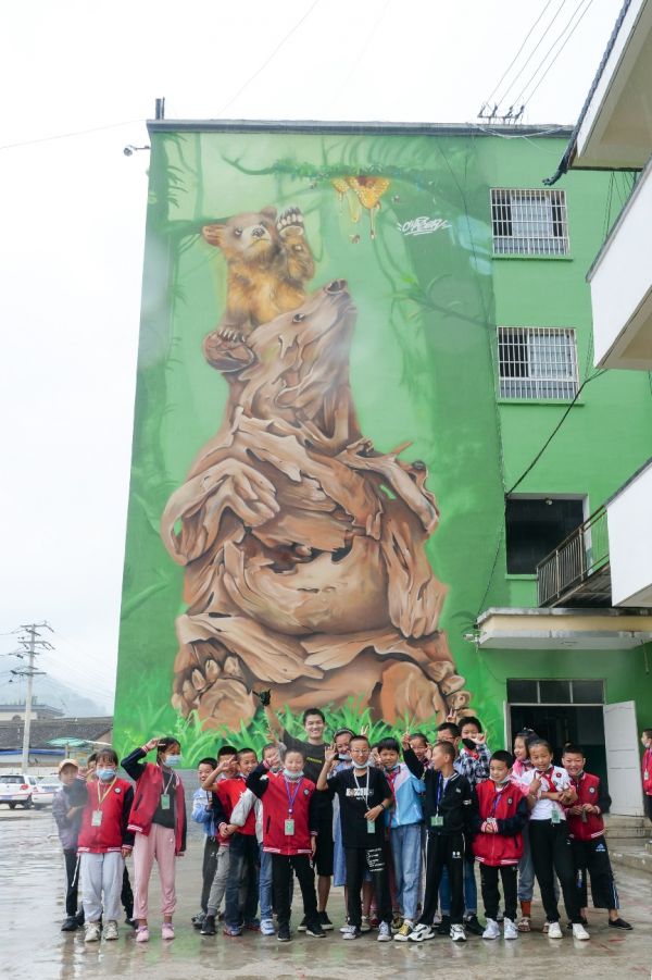 作为Stone Crew涂鸦艺术团体成员,设计师Chaser喜欢用简洁明快的配色,带给人们明亮和温暖。此次墙绘作品就以充满希望的绿色打底,可爱的小熊坐在熊爸爸的肩膀上,努力在森林里采蜂蜜。设计师用充满童话想象的画笔,定格了父子俩齐心协力,共同完成一件事情的温馨一幕。关于创作理念,Chaser表示跟大自然相比人类还是很渺小的,要懂得敬畏大自然保护环境。这次疫情又一次警示了人们,要爱护环境,保护动物。同时希望同学们拥有像蜂蜜一样纯净美好的童年,去创造属于自己的甜蜜人生。