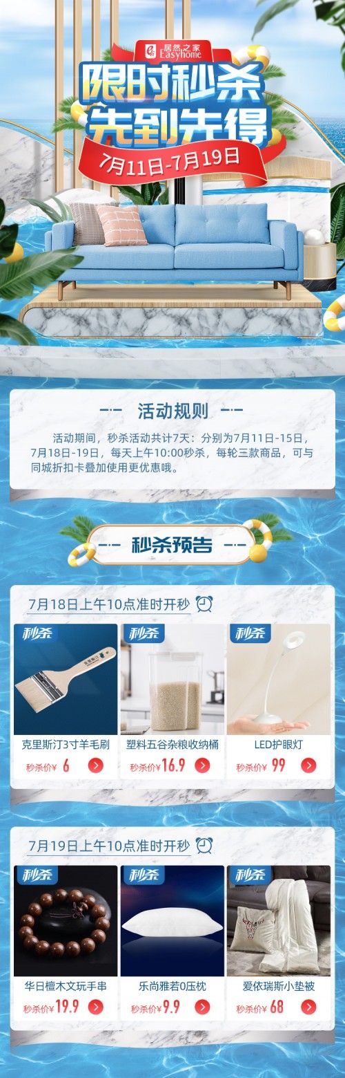 7月11日-19日,居然之家将线上线下联动,打造清凉夏日大促活动,通过同城站、淘宝直播、发放消费券等形式蓄客。