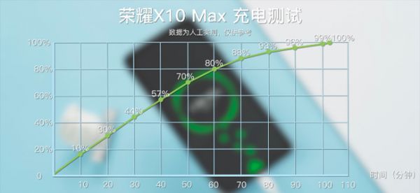 经过实测,荣耀X10 Max 10分钟充电16%、30分钟充电44%,100分钟左右可以完成100%充电量,其充电速度也非常惊人。