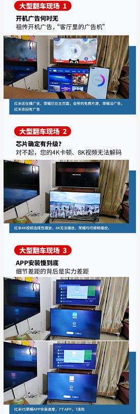 在开机速度对比环节,荣耀智慧屏X1凭借开机无广告和更强的性能再次获胜。在断电情况下,荣耀智慧屏X1的速度仍要快上一些。而红米电视X55在开机速度不仅更慢,过程中还出现了开机广告,十分影响使用体验。