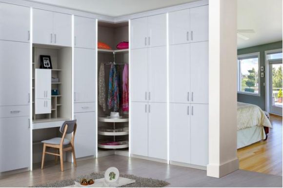 针对空间不规则的卧室,我们可以设计一个衣帽间让它变成规则。一统家居小编提示在设计的时候,可以考虑在不规则的空间设计一个隔断,不用考虑太多衣帽间内部形状,只要考虑把卧室隔出一个规则的空间来就可以了。