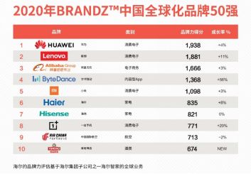2020年BrandZ中国全球化品牌五十强:有涨有跌