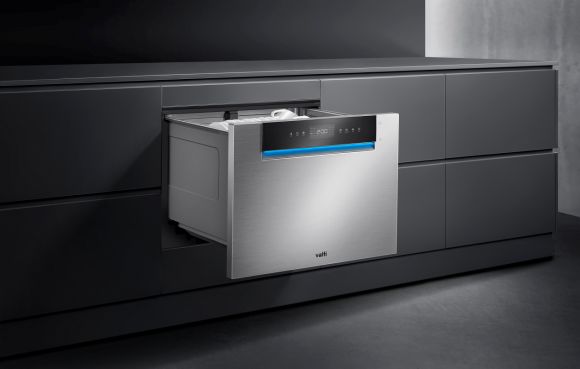 如果再进一步为老人考虑,手端着脏碗盘,很难再腾出手、弯下腰去打开洗碗机的柜门,可以考虑抽屉式洗碗机。比如华帝的V7洗碗机,自带AI变频智控系统。当手上有重物、或者有污渍时,只需简单的语音操控,洗碗机就能自动弹出。
