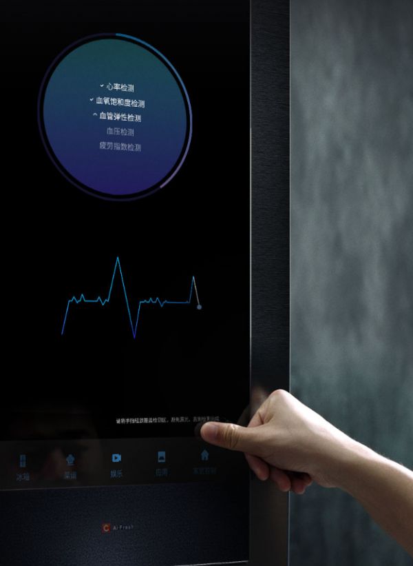 除此之外,TCL C5智屏冰箱还具有独特的“指脉识别”功能,用户只需要用手指放置在对应区域,冰箱就能识别血压、血氧饱和度、血管弹性等健康数据,并显示在智能大屏上,让用户掌握自己的身体状况,更加科学合理的安排每一位家庭成员的健康膳食计划。