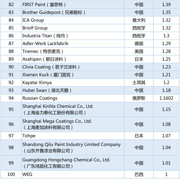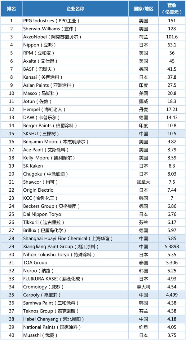 不过榜单上的企业变化并不是特别大,今年前三强依然是PPG、宣伟和阿克苏诺贝尔,销售额都超过了100亿美元。