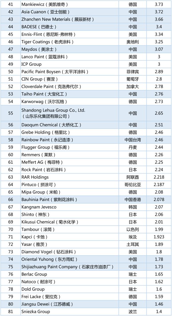 日本也比较厉害,前10名里有2个席位,分别是立邦、关西涂料。