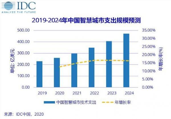 但是,IDC预测,在2020年至2024年的预测期内,全球智慧城市支出将在2021年开始逐步增长,复合年增长率(CAGR)为14.6%。