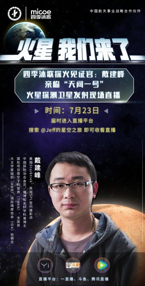 届时将在“天问一号”发射现场,通过照片和视频多视角还原“天问一号”发射现场盛况,并将以特有的仪式感为我国首次探测火星任务圆满成功献上美好祝愿。此外,戴建峰(Jeff)作为四季沐歌探火见证官的代表,更将在现场开展“天问一号”发射相关的直播活动,以逼真的视角、高清的画面和深入浅出的讲解为大家上演一场科技大片,不仅能足不出户便可实现亲临现场的观看体验,还能通过他的讲解和现场互动让观众们收获更多天文和航天知识,同时满足大家对“天问一号”的关注及对星空宇宙的好奇。