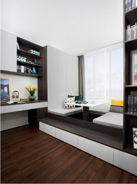 集成家居拾光,是智慧的空间收纳大师,区别于降低物欲需求的粗暴式“断舍离”,拾光更懂得通过对空间赋予不同的定义来解决空间不够的难题。多功能房的打造就是一个很好的答案,这是一个极具实用性的百变空间:平时它就是你学习思考的书房,有客来访它就是让客人舒适下榻的客房,气动式升降桌上升,它又变成了一个具有日式风情的茶话会空间,最重要的它还是一个空间超大的隐藏储物室,将凌乱隐藏,还会犯愁空间不够用么?