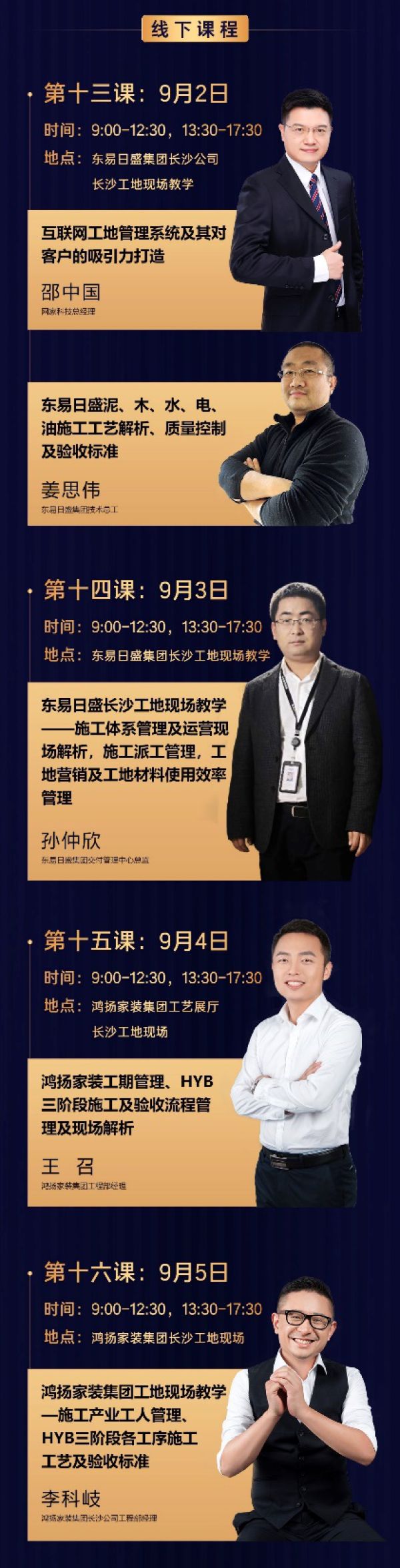 提质班专注于传授掌握品质工地打造的系统理论与方法,全面增强家装企业施工管理能力,显著提升家装工地施工品质,建立学员企业在市场竞争中的工地品质核心优势,在学习过程中,该班导师和学员将携手全国工商联家具装饰业商会,推出中国首个《家装工地(工程)管理标准》和《中国家装工程施工交付标准》,助推行业在家装施工管理和家装工地质量把控上建立并推广全国行业标准,有效提高全行业在家装工程交付领域的整体水平。课程内容包括家装工程团队建设与管理,设计运营对于工程运营和交付质量的控制,泥/木/水/电/油施工工艺解析、质量控制及验收标准,整装施工要点与施工安排等课程,系统、全面的解析家装施工过程中工地管理、工艺标准、材料使用、成本控制、质量管控、科技监管、工人素质培养等综合内容体系。