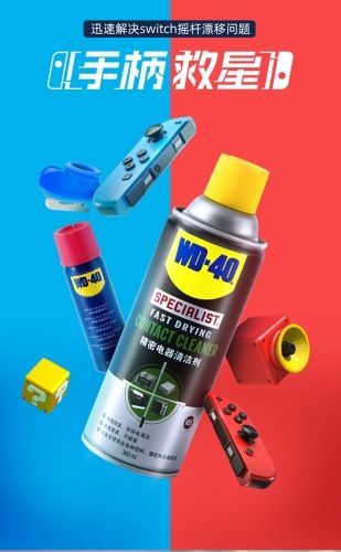 有些人可能会说这种专业清洁除锈剂,在生活中用到的情况会很少。但在switch手柄用户眼里,WD-40小蓝罐简直就是宝贝。switch的手柄摇杆飘移问题一直存在,但这并不影响switch拥有众多的玩家。很多买了switch手柄的人,玩一段时间以后,会出现摇杆漂移的现象,想了很多办法都没有解决。导致漂移的原因本质上来说都可以归咎于「接触不良」,一方面摇杆的部分由于设计原因可能更容易进入一些粉尘碎屑,另一方面在使用摇杆本身时,由于长时间的摩擦,也可能会导致一些金属粉尘掉进去,而金属粉尘是导电的,所以会导致Switch手柄短路失灵和漂移的情况。对于switch手柄来说,这两种现象都是不可避免的。你的switch手柄飘了吗?