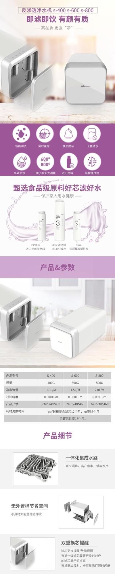 今天推荐大家一款颜值高又能提高生活品质的反渗透净水机——阿尔莎娜S-400/600/800,小身材大智慧,高颜值更强“净”。