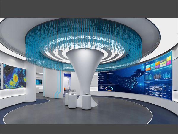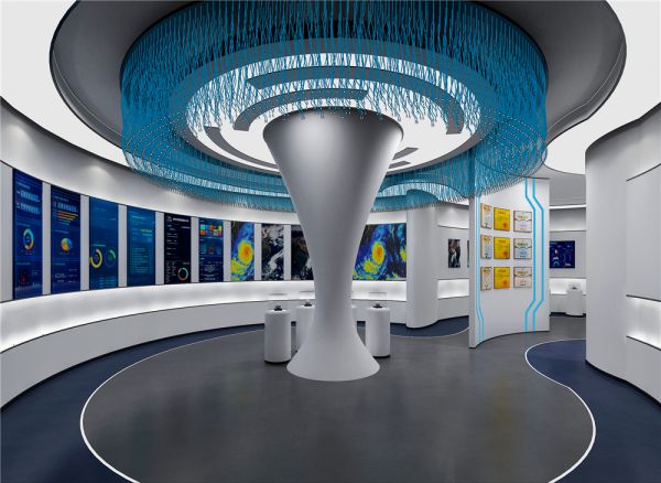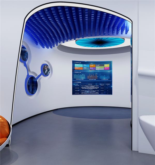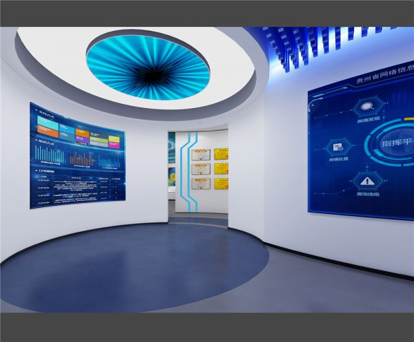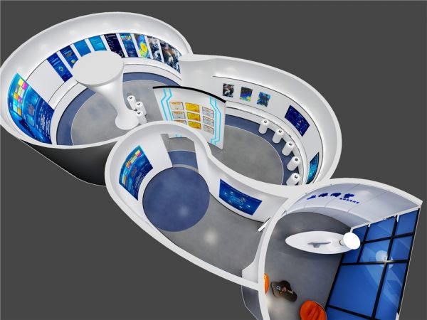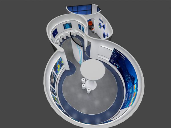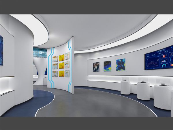 上海同望(遵义)科技展厅,展示科技成果,白色色调,弧形造型,穿插科技蓝,展览路线顺畅有韵律,空间丰富有变化。简洁造型、色彩简练、参观动线流畅。