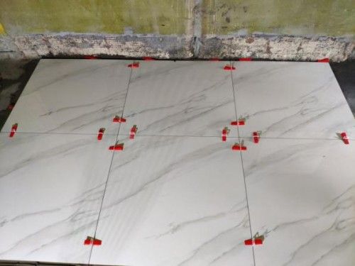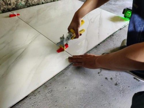 在施工时,圣诞鸟整装工人师傅在砖与砖之间,还会用这种红色的找平定位卡对地砖进行固定,标准大小的找平定位卡,可以使砖与砖之间的缝隙大小均一。同时,地砖的铺贴效果也更加平整。待底层的瓷砖胶粘合剂固定后,便可将找平定位卡取下来了。