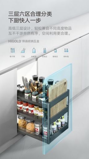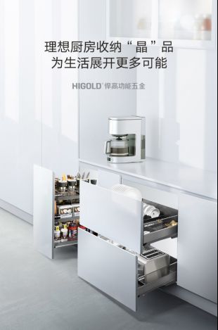 悍高厨房收纳五金希勒3.0古驰系列,收纳有术,给你提供高品质的厨房生活。让厨房物品有地可去,桌面自然变得整洁。拥有一个干净明亮的厨房,做饭心情也会变好!