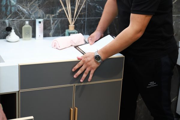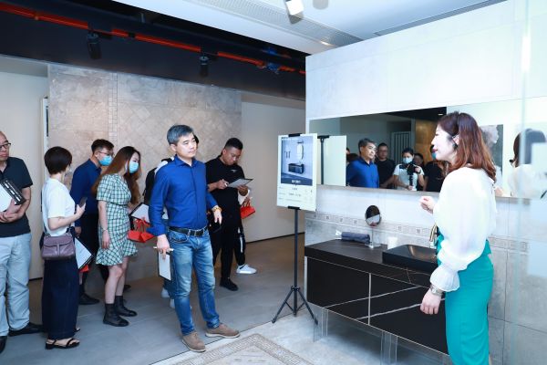 最后,金岩板家居执行总经理陈丽亚为现场的嘉宾介绍了金岩板家居的产品。陈总作为原日本建材卫浴巨头企业研发人员、日本株式会社CCN副社长,与金意陶达成技术与企业管理合作。她通过讲述岩板的优点与岩板浴室柜加工的痛点,诠释出金意陶推出的新品岩板浴室柜与同行内的岩板浴室柜的差异,并且经过其团队的努力,不但克服了产品的痛点还提出了 “不用伸进脏水也可以放水的时代已经到来”,其提拉式下水器是从日本引进使用汽车刹车线原材料配件,并且该配件是可经过10万次使用不损坏。随后陈总带领各位嘉宾前往展厅进行实物品鉴。