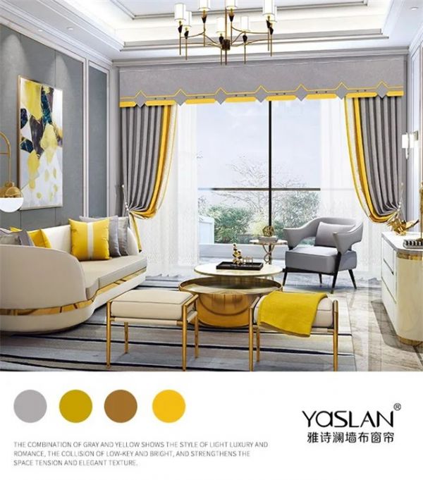 雅诗澜的这款窗帘,其中的柠檬黄在这样低调的烟灰色中显得跳跃,非常适合做小面积的点睛之笔,犹如夜与光,极致亮眼的视感中演绎着别致的优雅与魅力。