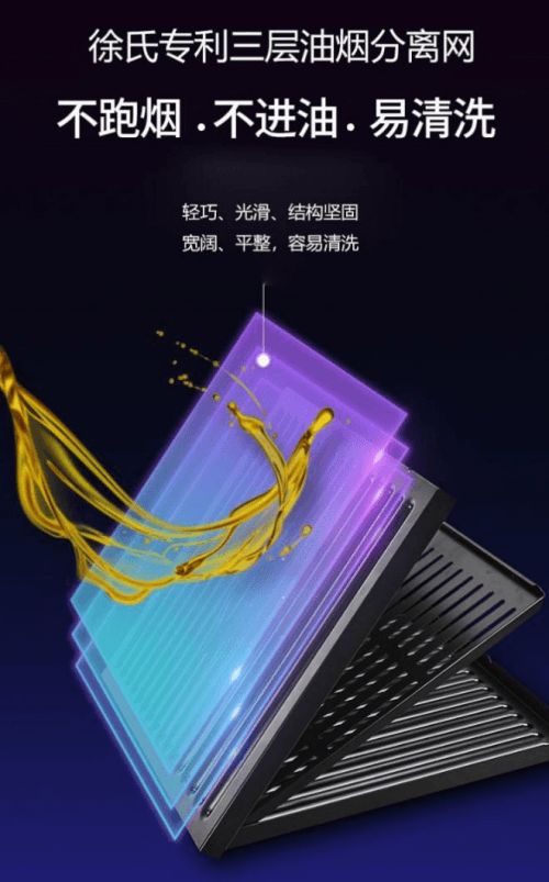 值得一提的是,MOOVCOOK移动厨房推出的新款“王者”系列大风量烟机匹配了两块超大面积的“徐氏专利三层油烟分离网”。